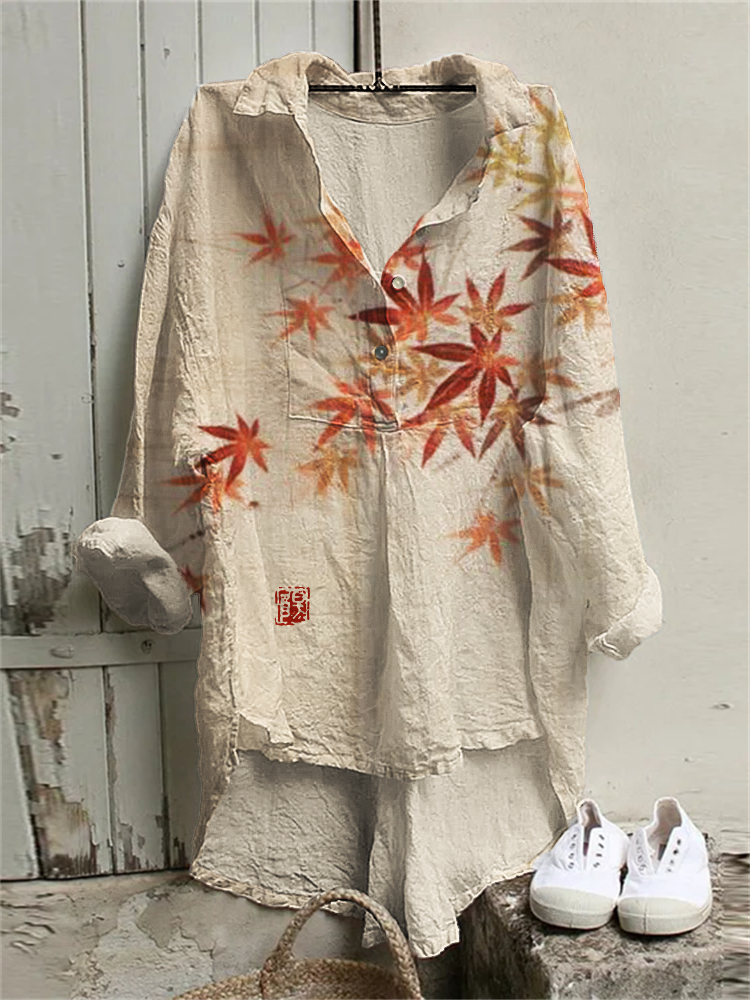 Maple Leaves Japanese Art High Low Linen Blend Tunic