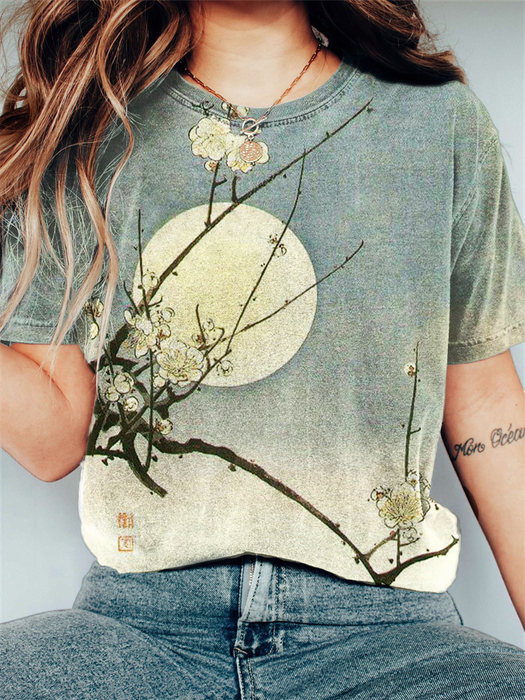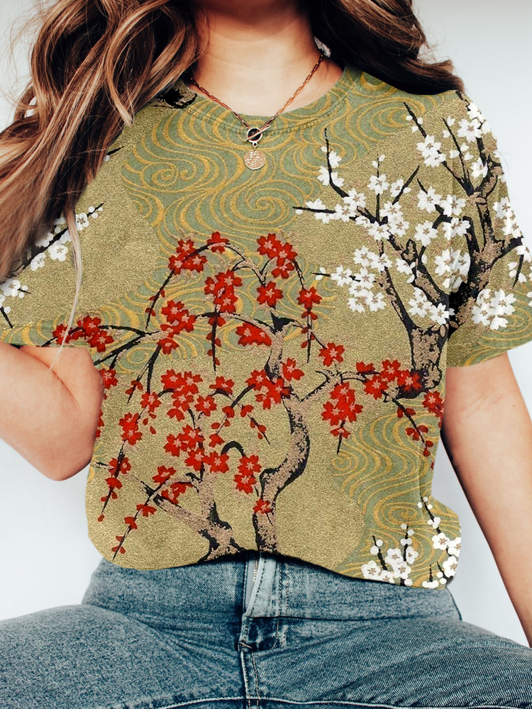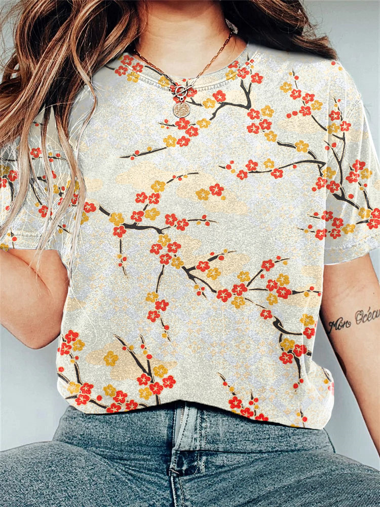 Plum Blossom Japanese Art Print Casual Vintage T-Shirt