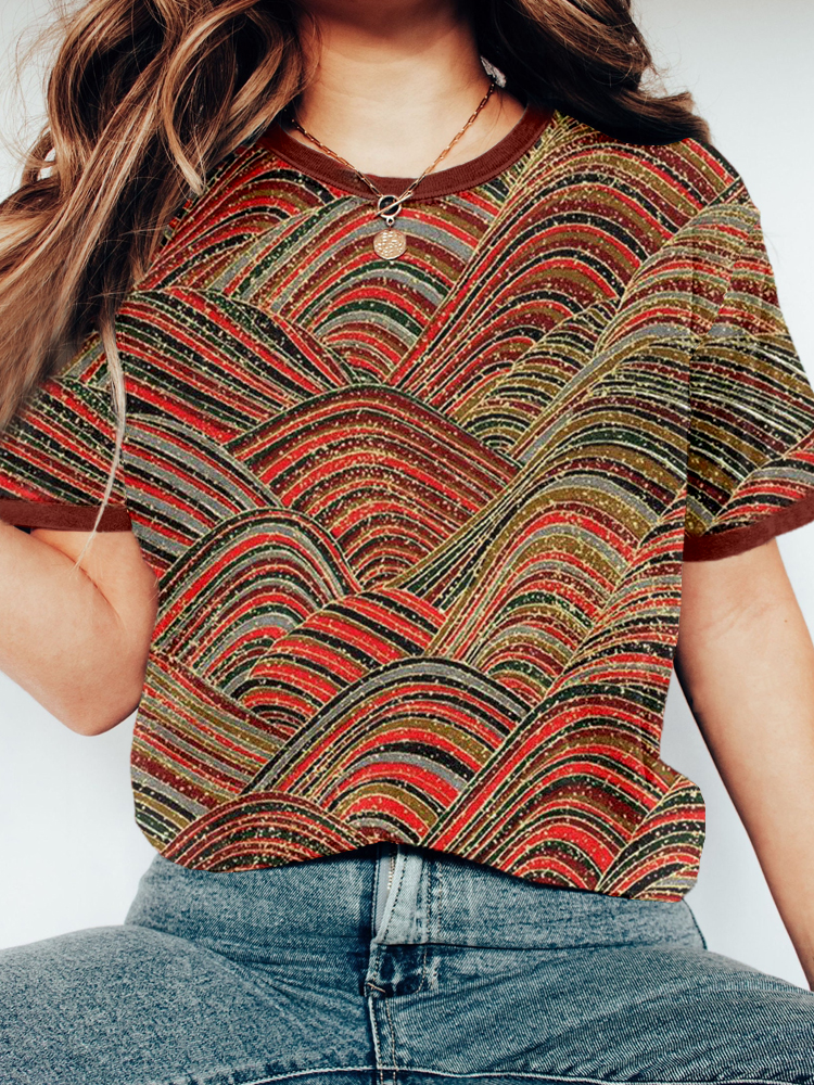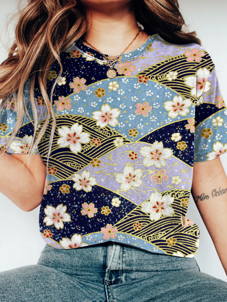 Japanese Art Print Round Neck Short Sleeve Casual T-Shirt