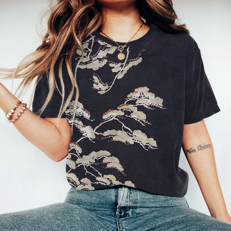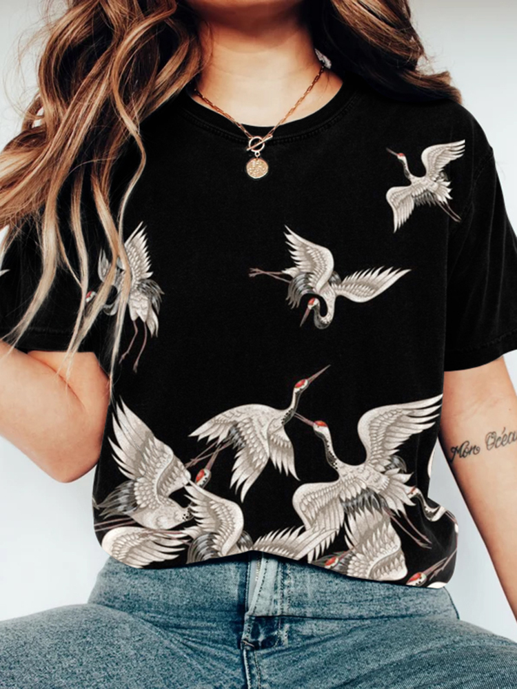 Cranes & Floral Embroidery Art Vintage T Shirt
