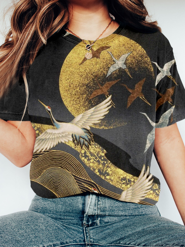 Japanese Cranes Flight to Golden Moon Art Comfy T Shirt