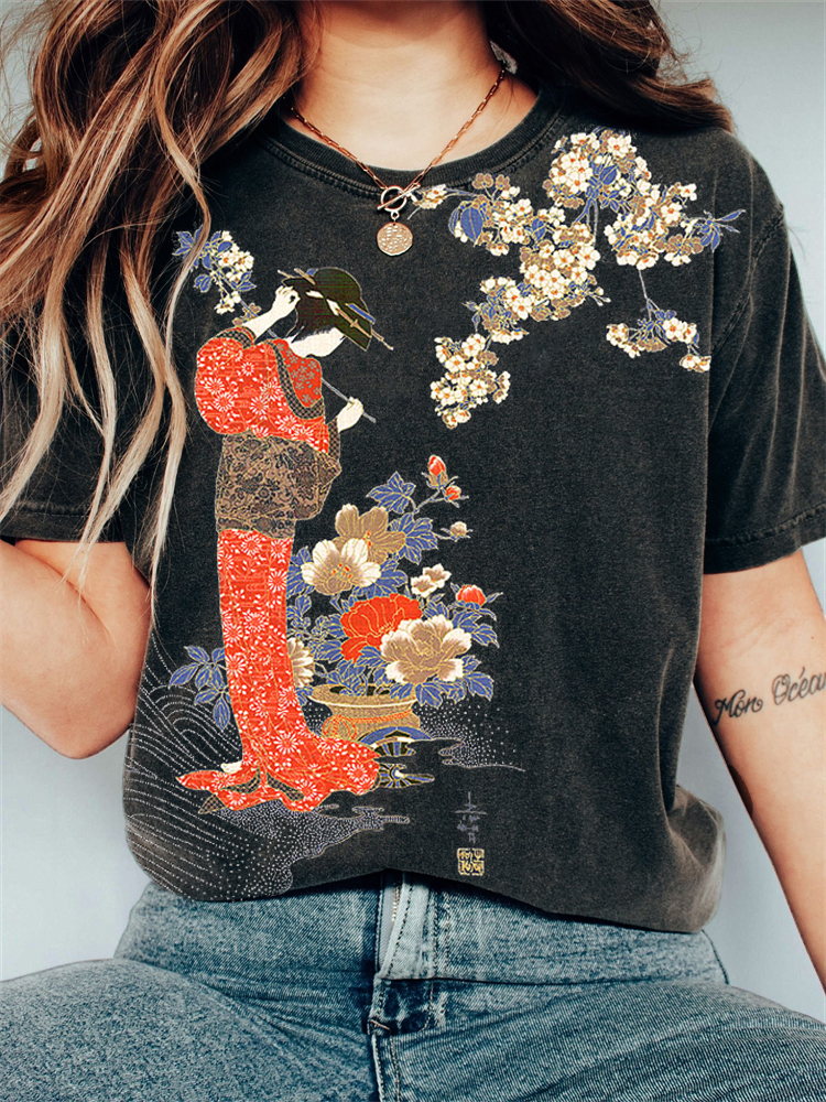 Elegant Japanese Geisha with Flowers Art Vintage T Shirt