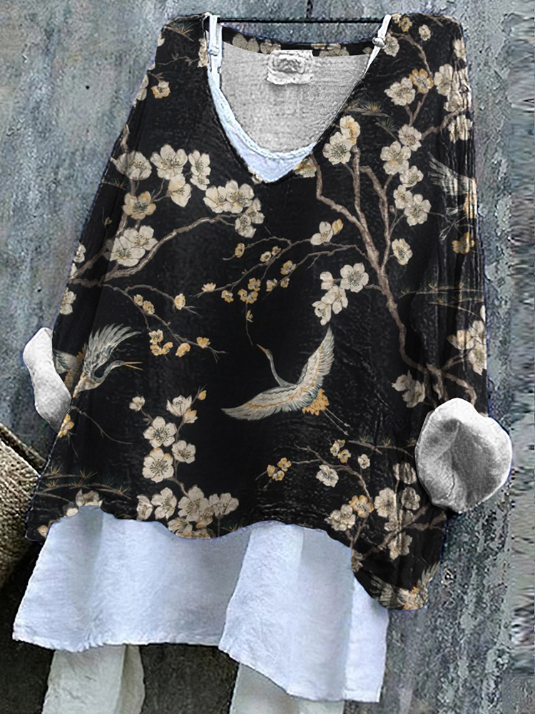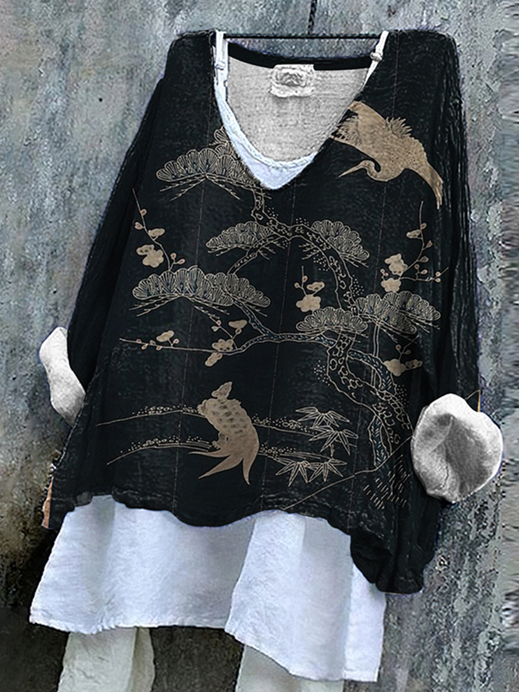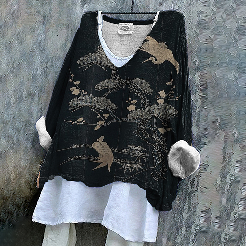 Crane Print V-Neck Loose Blouse