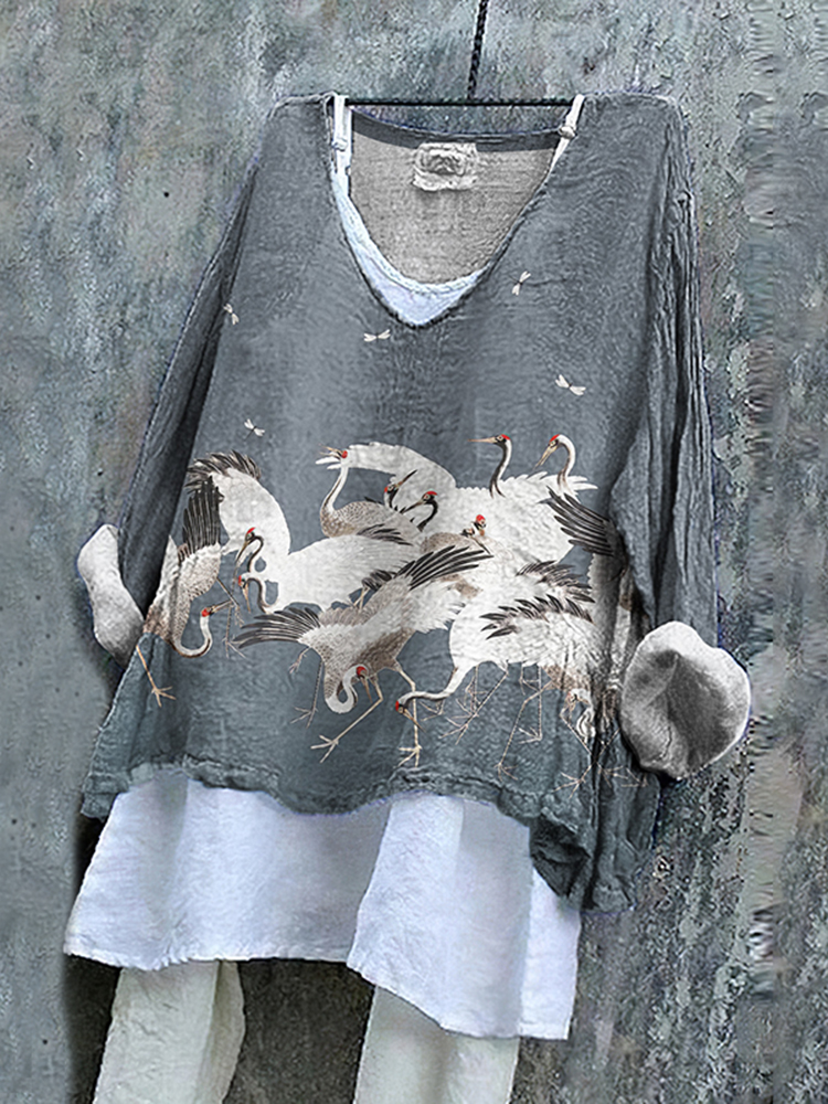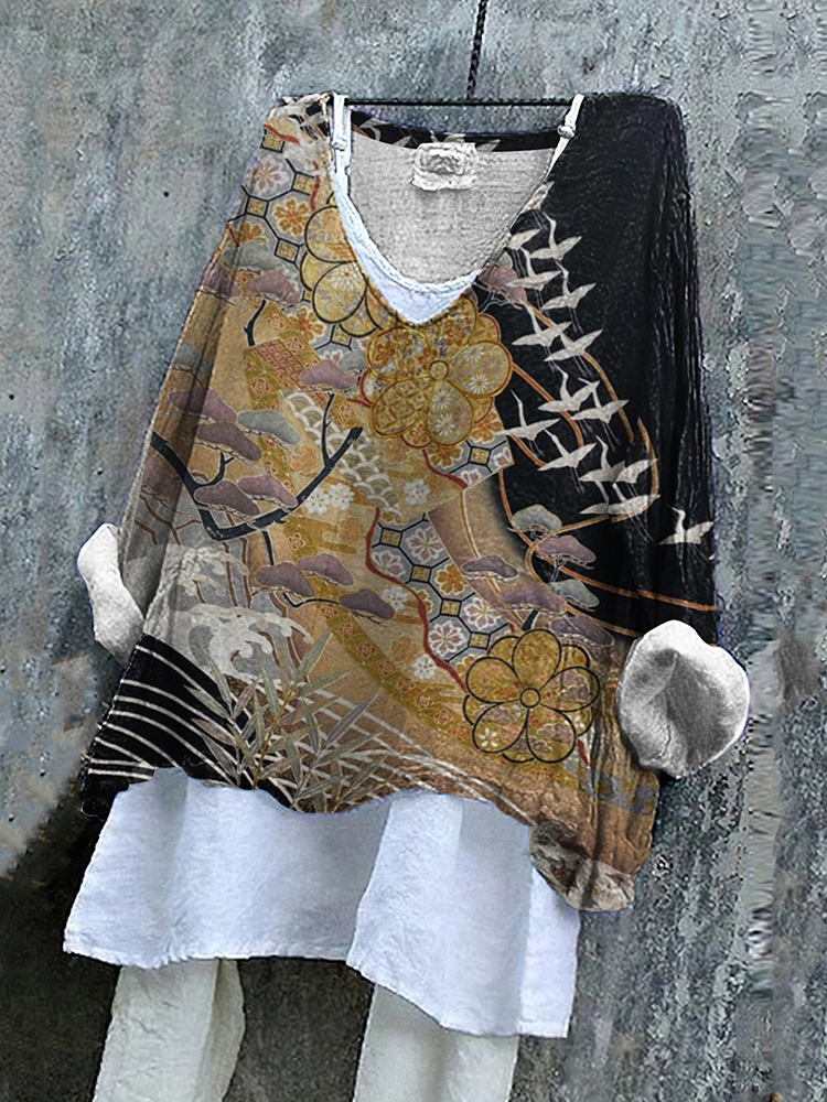 Japanese Crane Formation Pattern Linen Blend Flowy Tunic