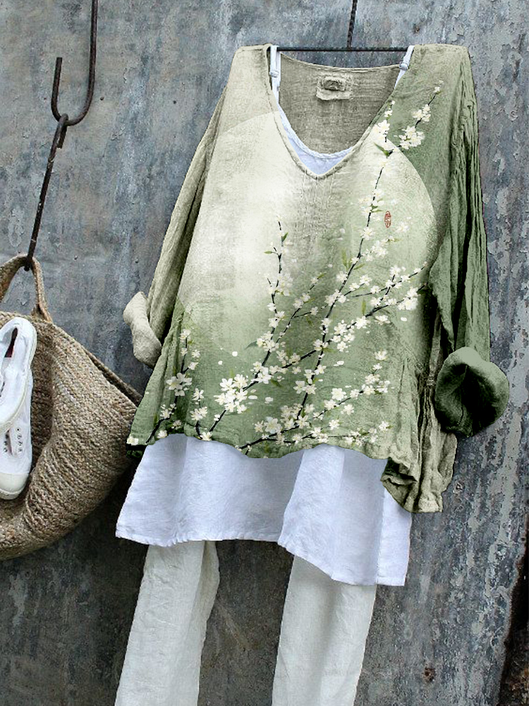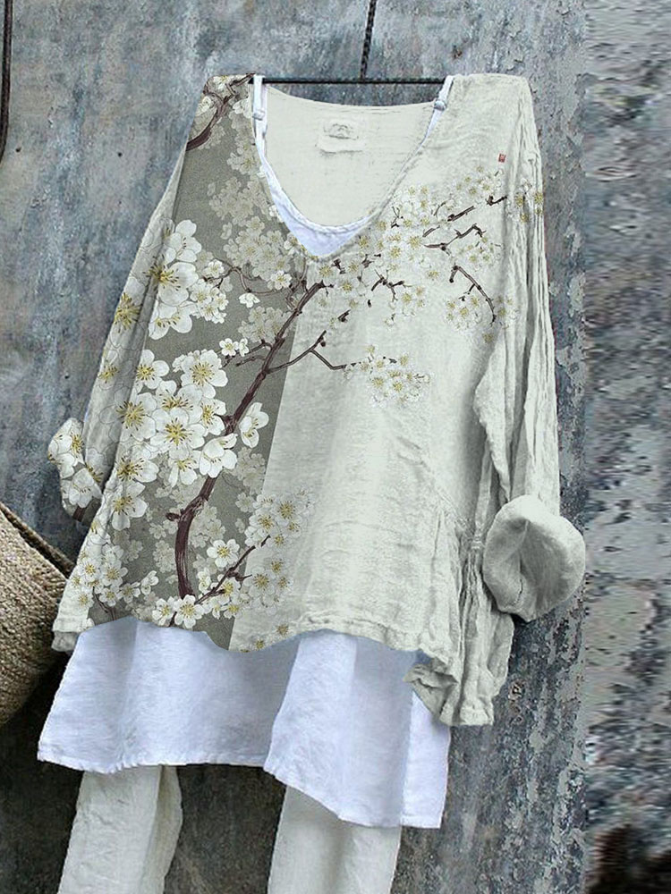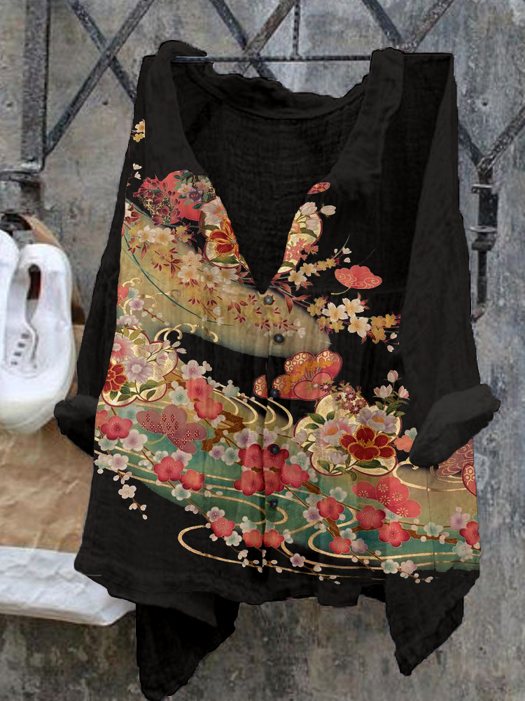Vintage Japanese Art Sakura Cotton Linen V Neck Comfy Shirt
