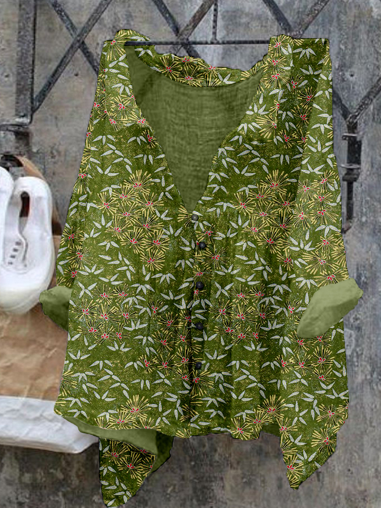 Vintage Japanese Art Pine Cotton Linen V Neck Casual Shirt