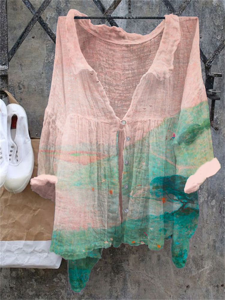 Ink Landscape Print Linen Loose Shirt