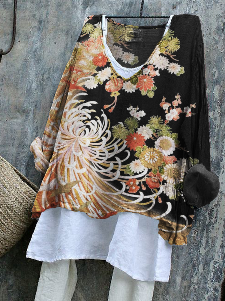 Chrysanthemum Japanese Floral Contrast Linen Blend Tunic