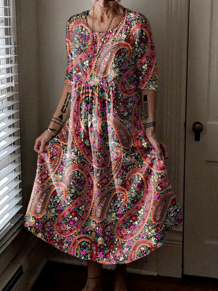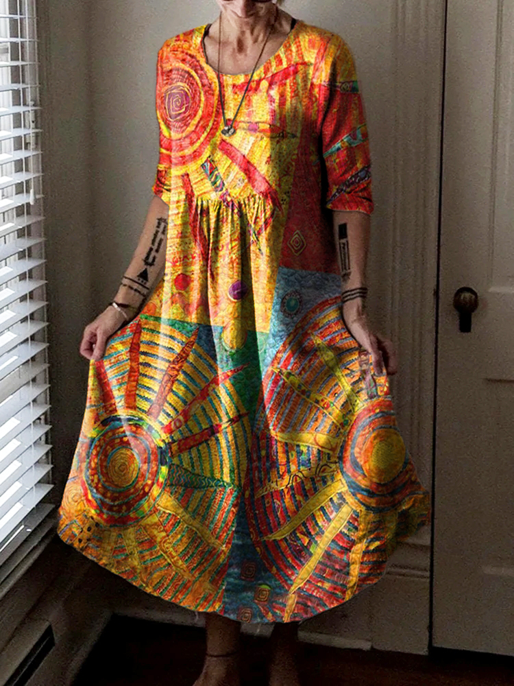 Women's Hippie Art Floral Print Crew Neck Dress