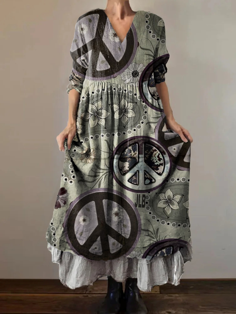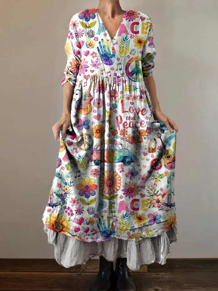 Women's Hippie Peace Love Art Print V-Neck Button Pocket Cotton Dress