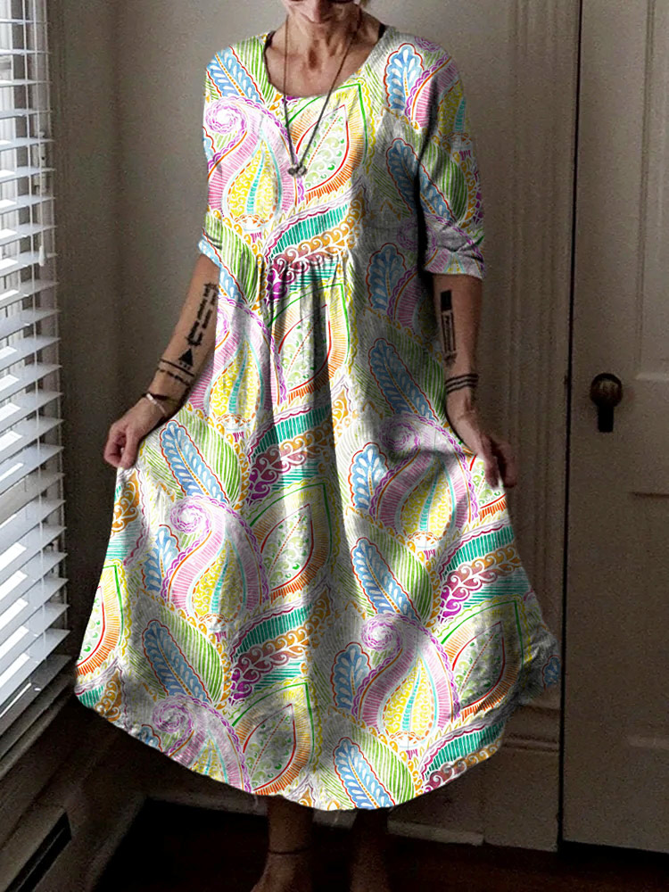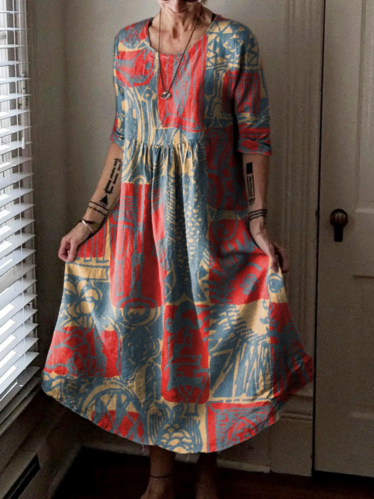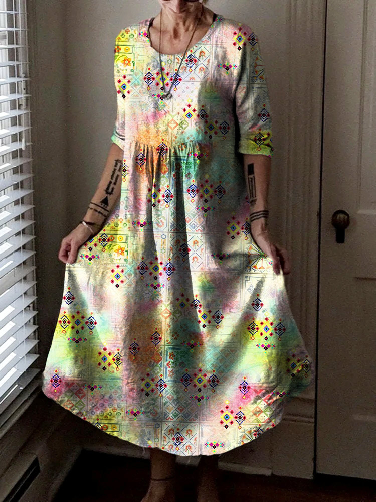 Women's Bohemian Ethnic Collage Art Print Pocket Cotton Dress