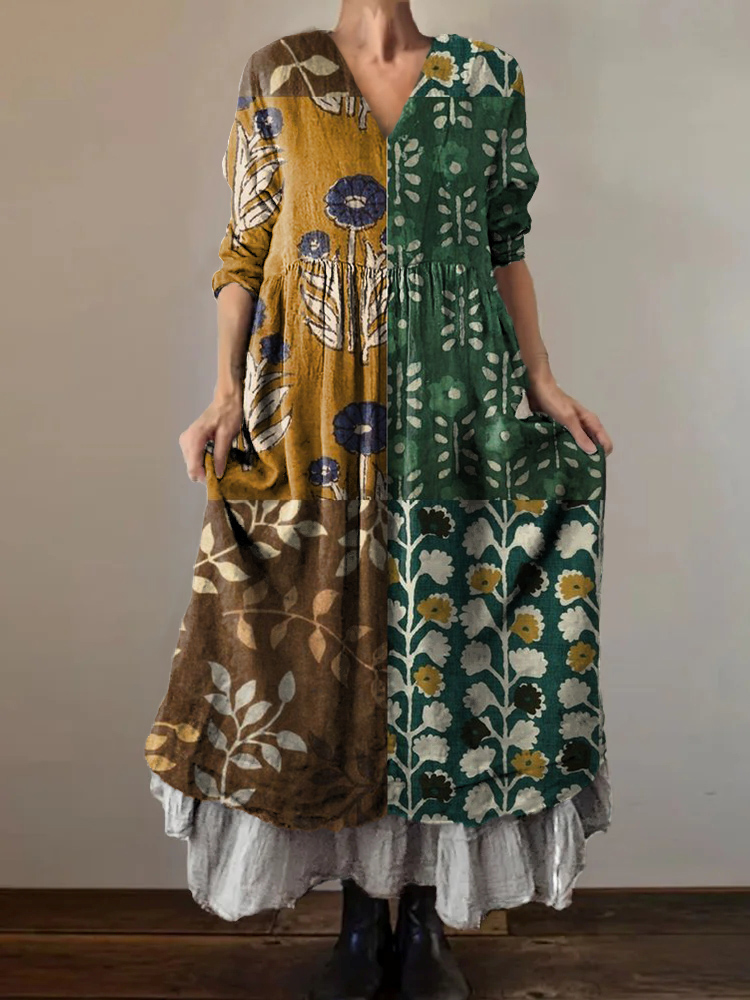 Women's Vintage Patchwork Art Print V-Neck Button Pocket Cotton Dress