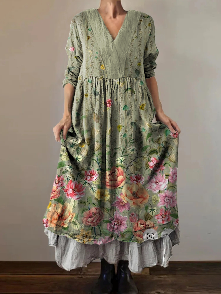 Women's Botanical Floral Colorblocking Pattern Art Print V-Neck Pocket Cotton Dress