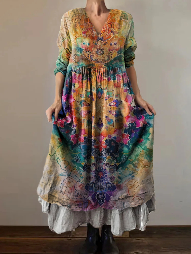 Women's Tie-Dye Mandala Art Print V-Neck Button Pocket Cotton Dress