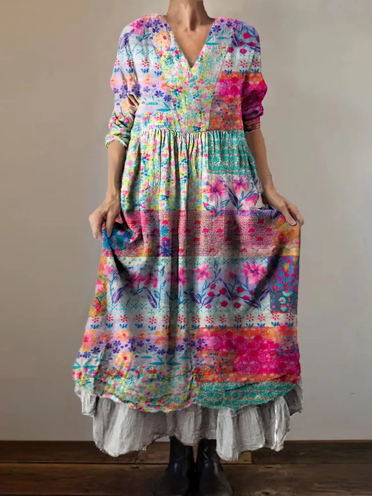 Women's Vintage Floral Patchwork Art Print V-Neck Button Pocket Cotton Dress