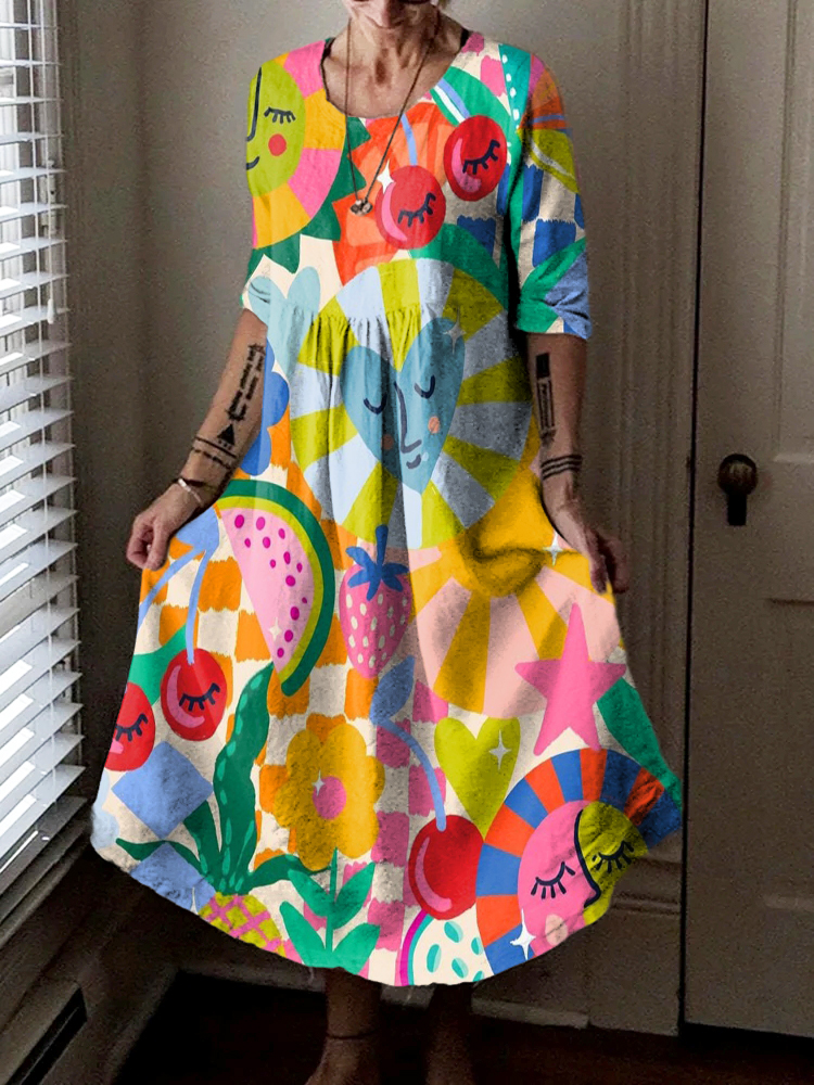Women's Bohemian Hippie Colorful Collage Art Print Long Sleeve Pocket Cotton Dress