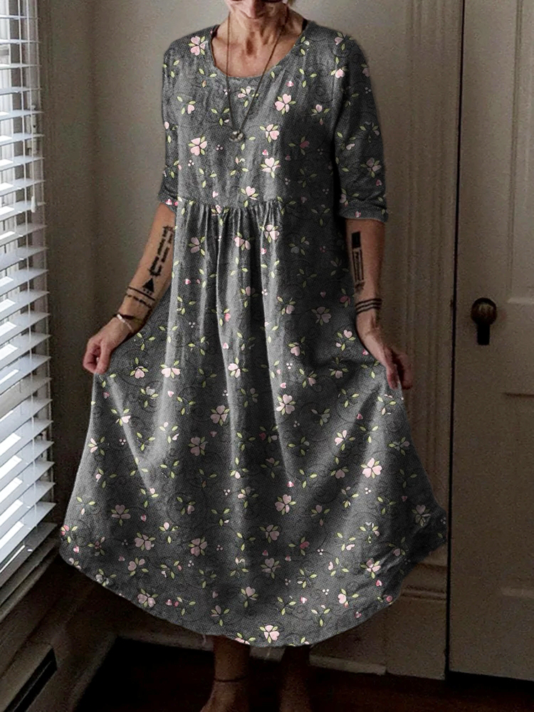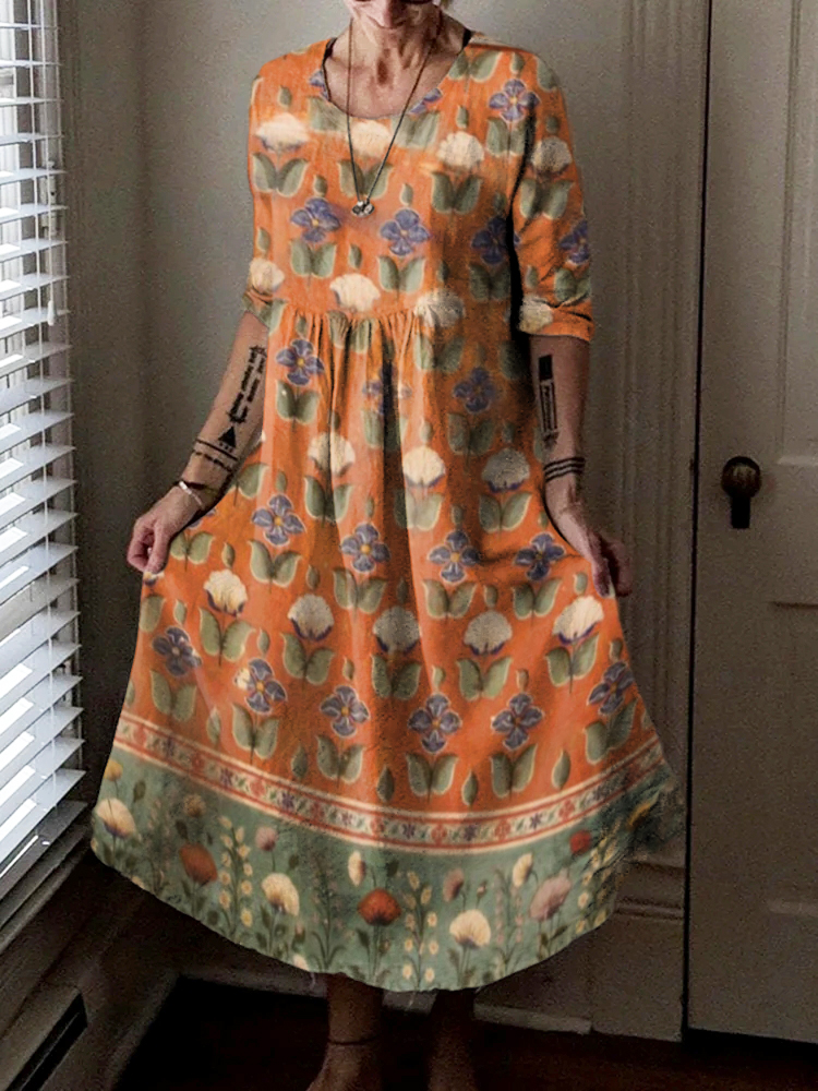 Women's Vintage Floral Art Print Pocket Cotton Dress