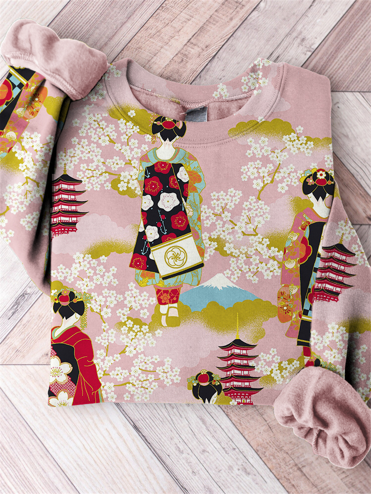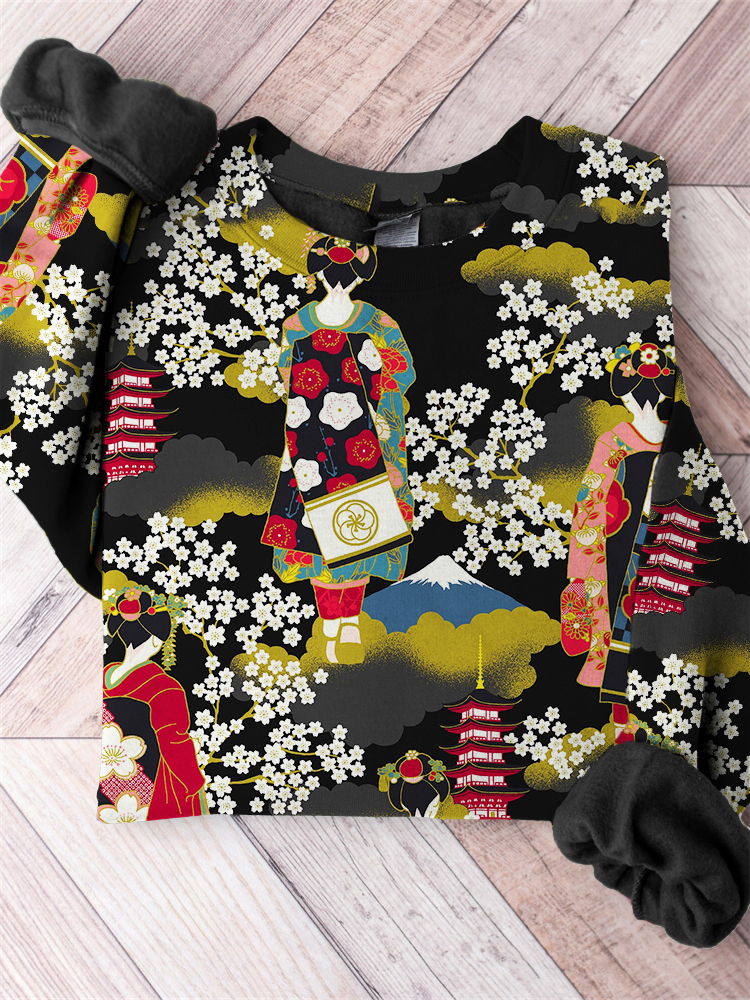 Geishas & Japanese Symbols Floral Pattern Comfy Sweatshirt