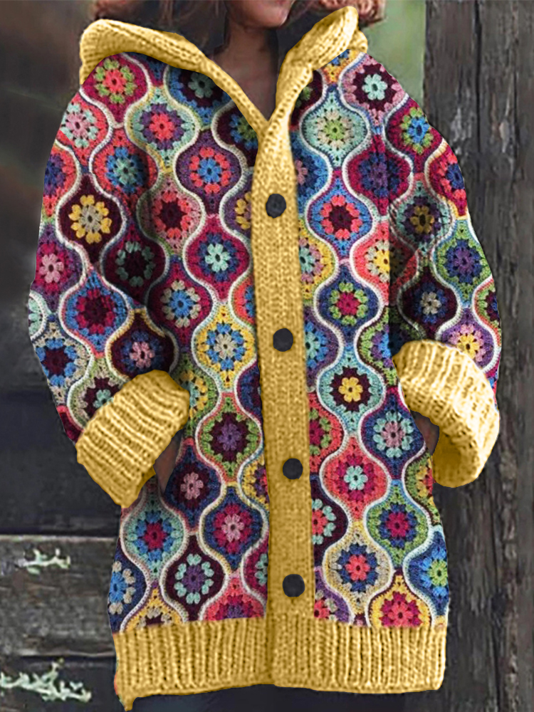 Boho Colorful Floral Crochet Cozy Hooded Cardigan