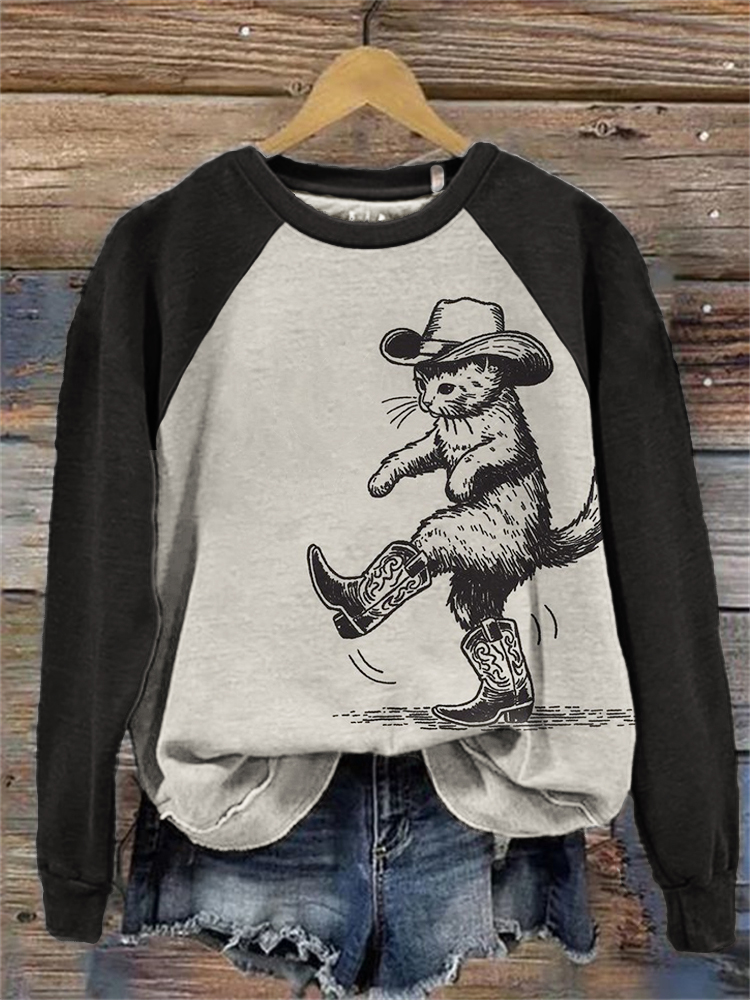 Lovely Cat Cowboy Contrast Color Raglan Sweatshirt