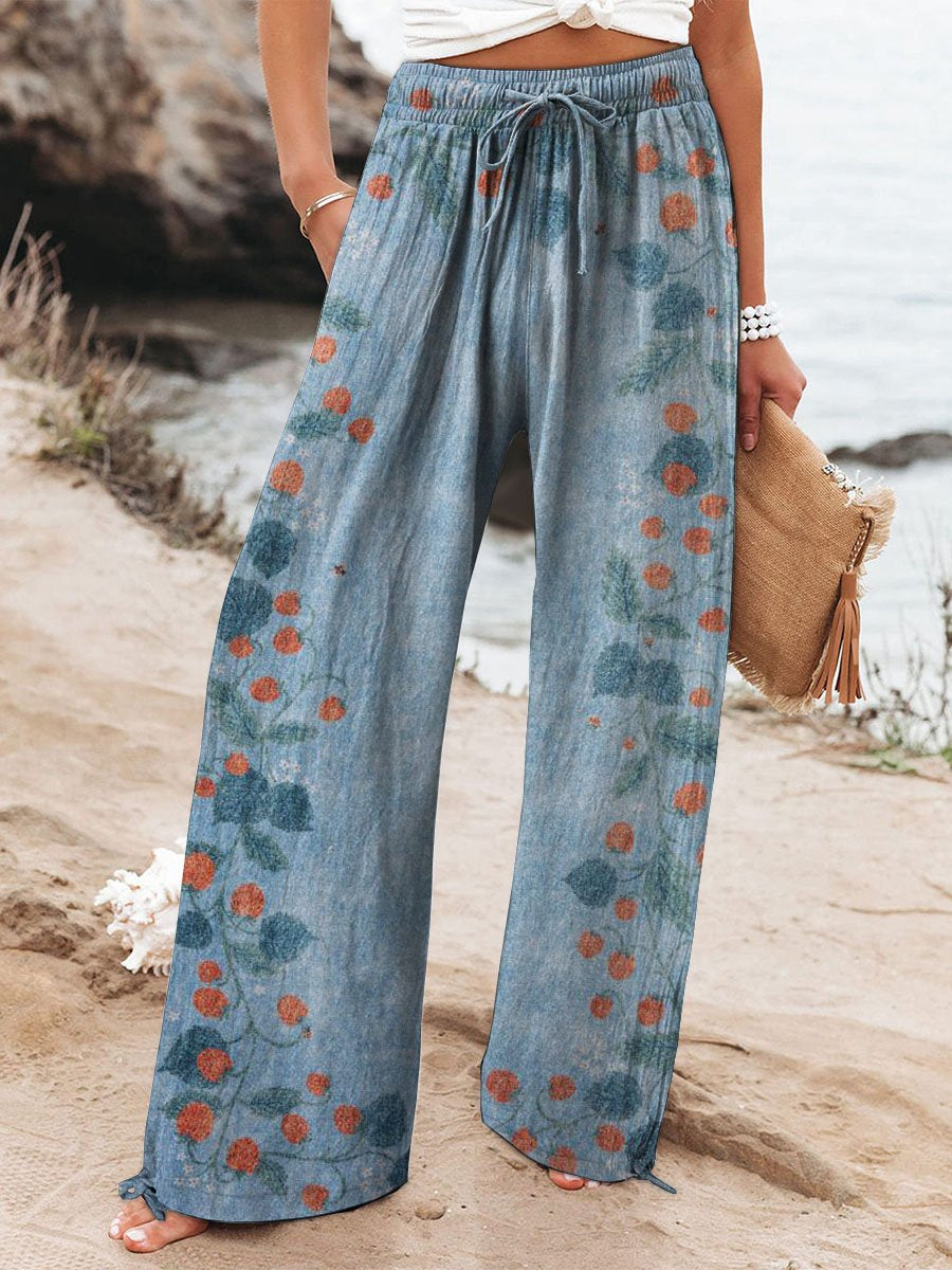 Women's Retro Floral Art Printed Cotton And Linen Casual Pants