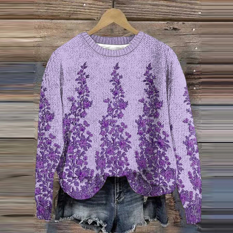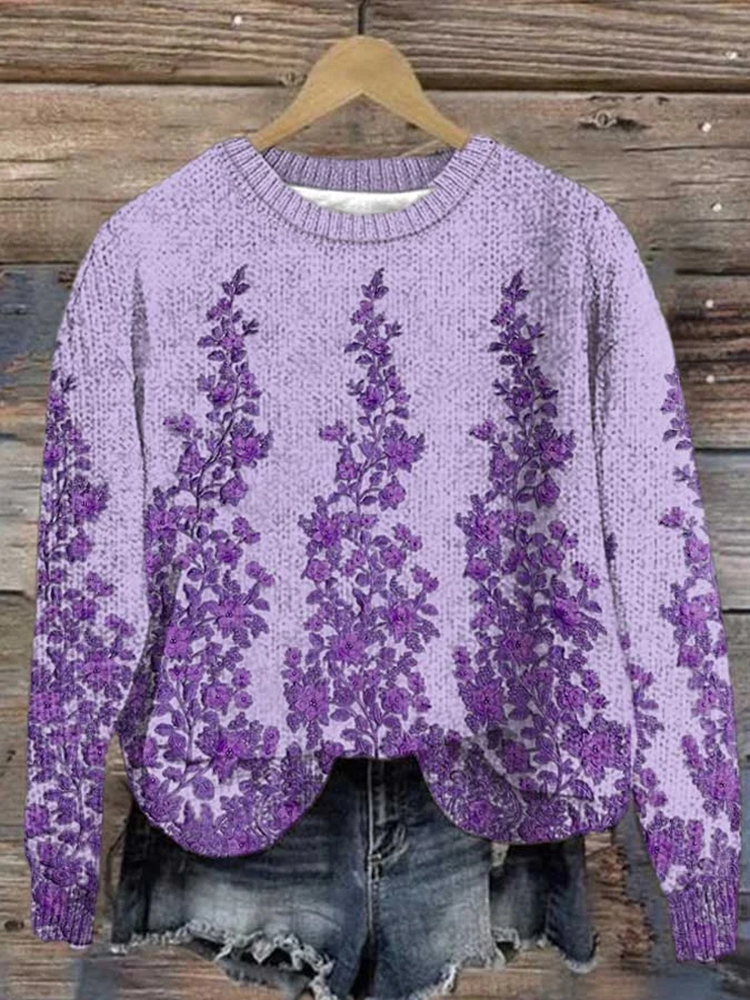 Vintage Purple Floral Embroidery Jacquard Cozy Sweater