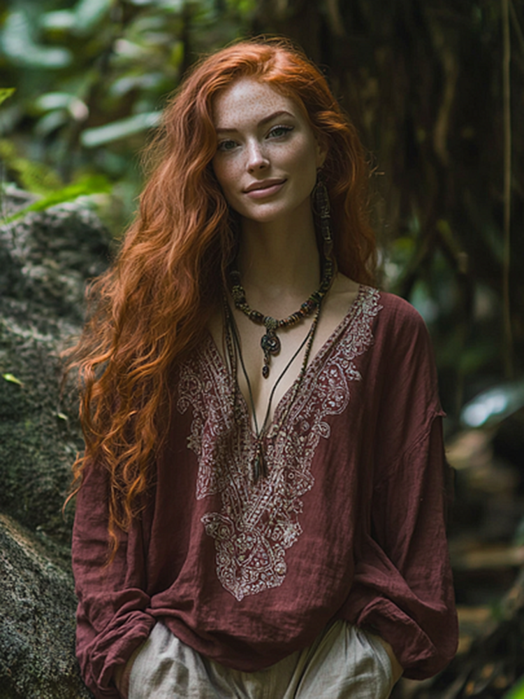 Retro Holiday Bohemian Art Holiday Print Cotton And Linen Blend Loose Blouse