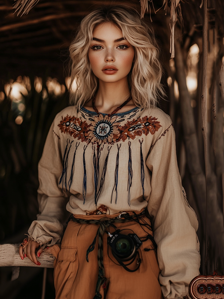 Bohemian Holiday Style Tribal Embroidery Print Cotton And Linen Blend Loose Blouse