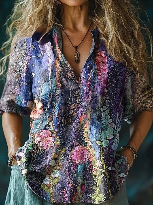 Women's Floral Art Print Casual Cotton And Linen Shirt