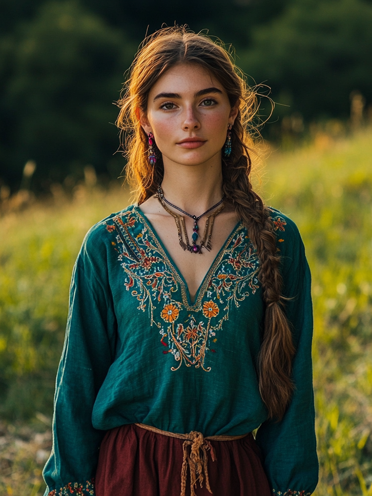 Boho Floral Embroidery Art Linen Blend V-neck Blouse