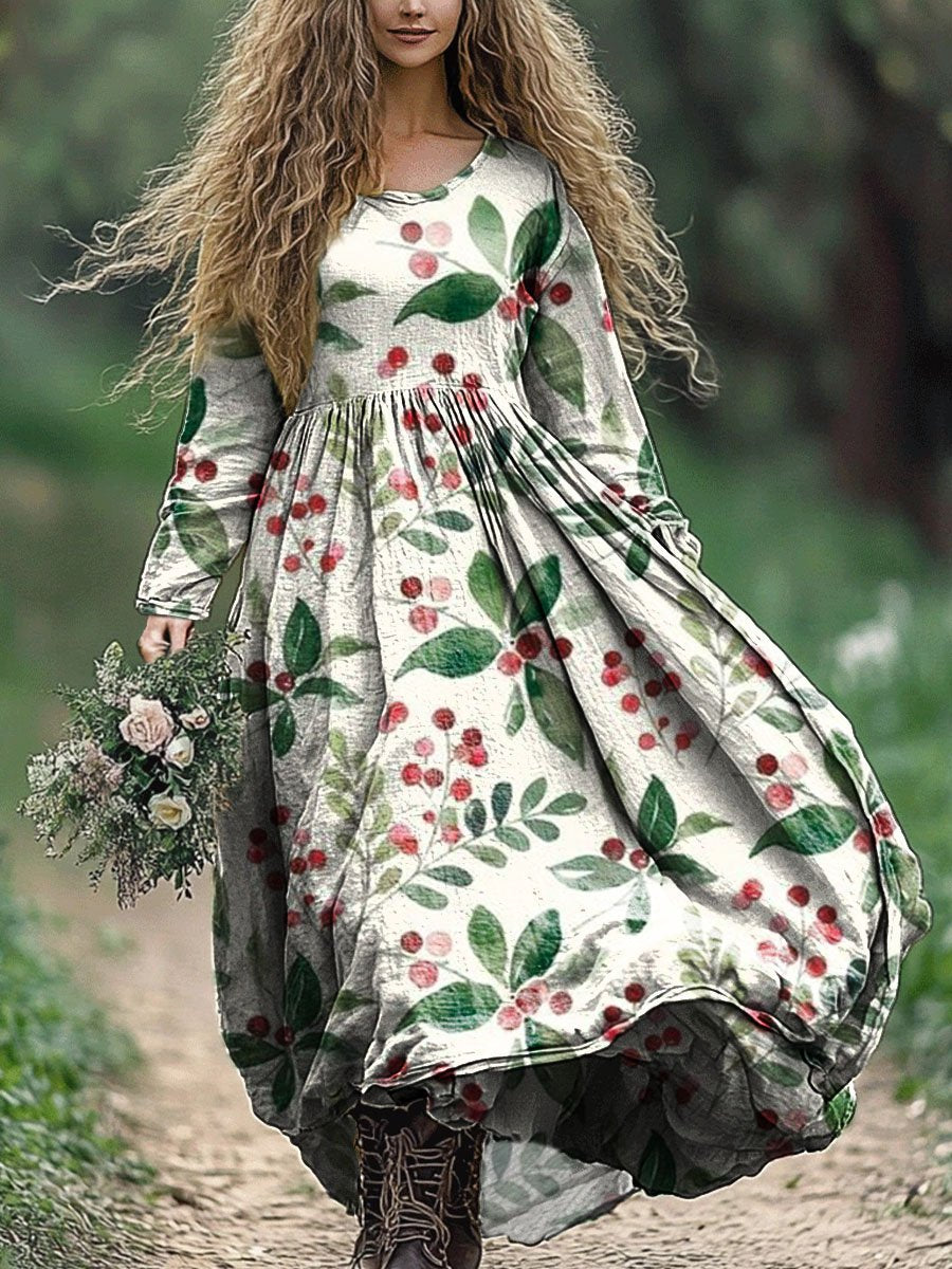 Women's Leaves and Red Fruits Art Print Pocket Cotton Dress