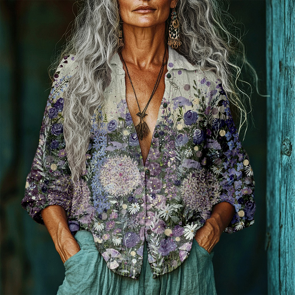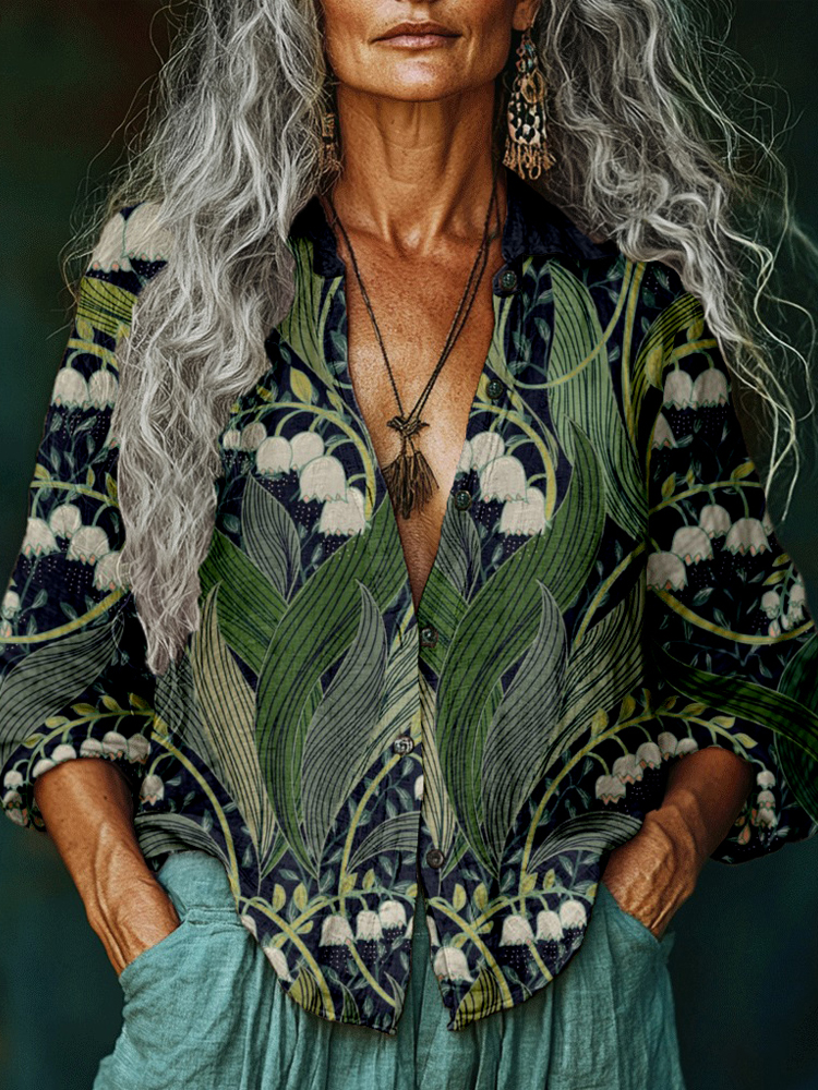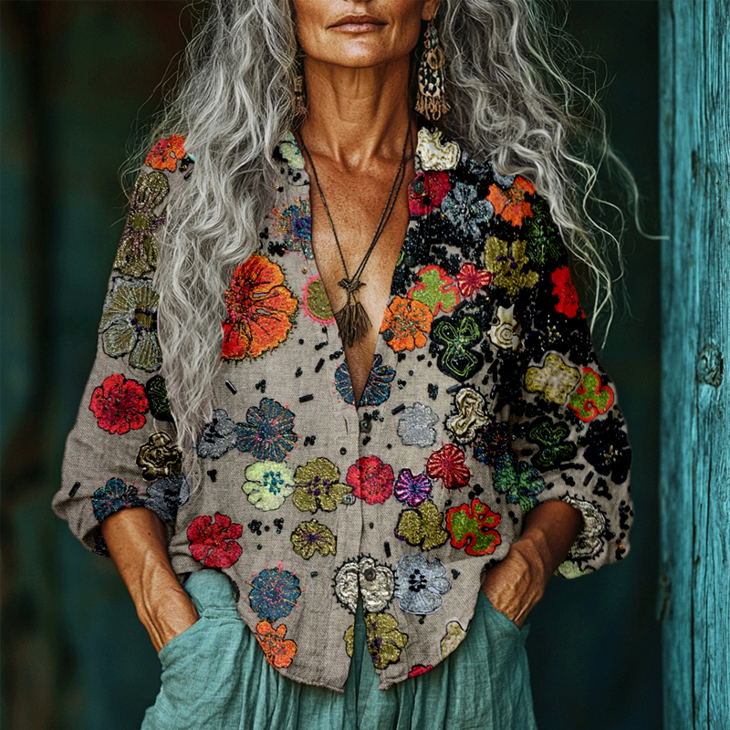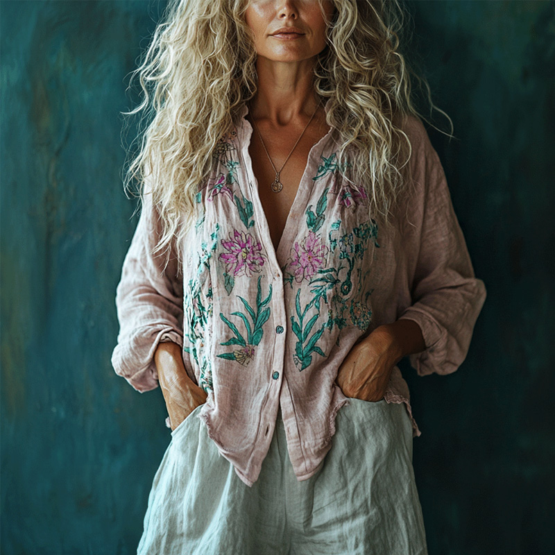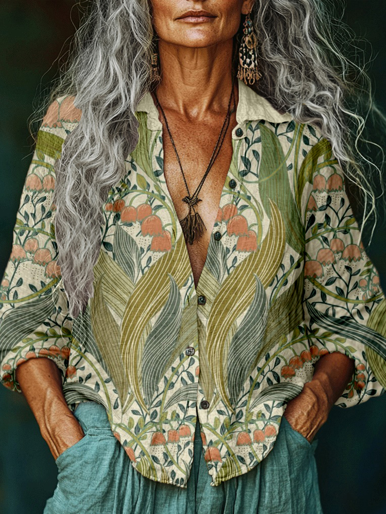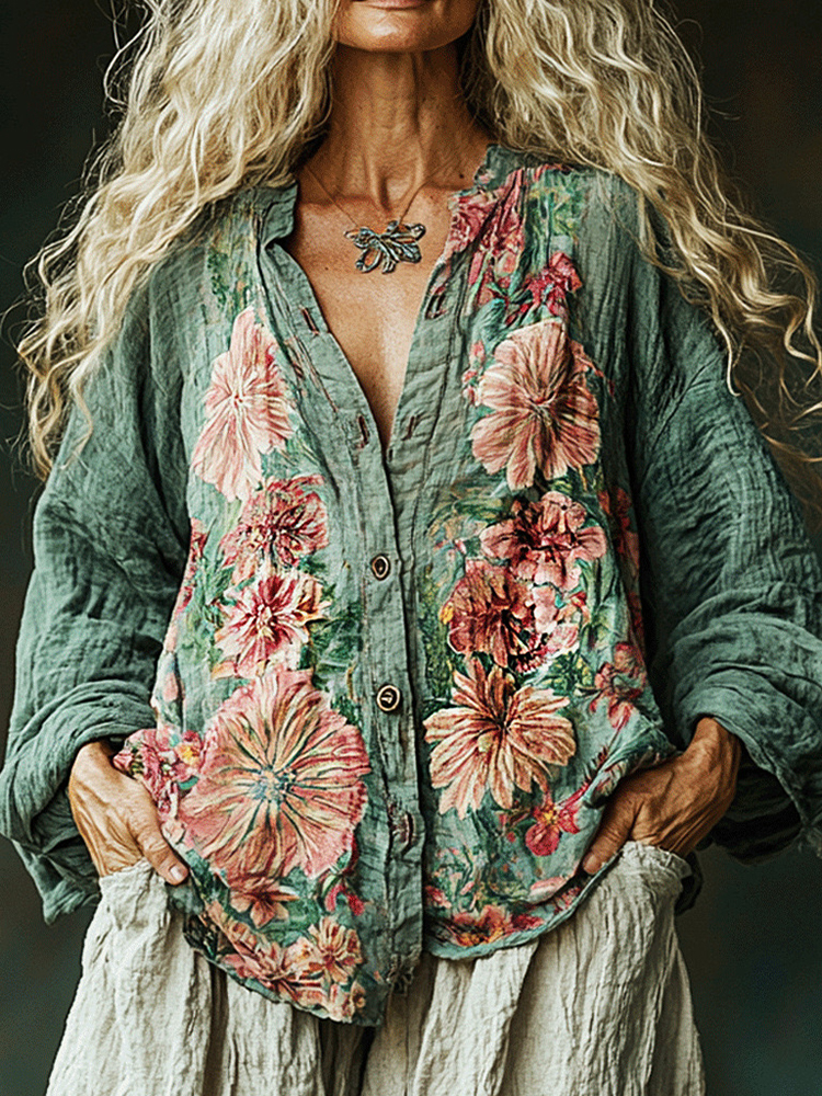 Bohemian Style Linen Floral Art Print Long Sleeve Shirt