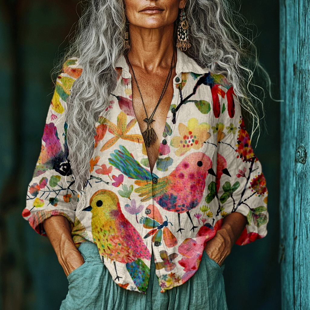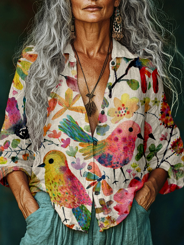 Vintage Colorful Bird & Flower Linen Blend Cozy Blouse