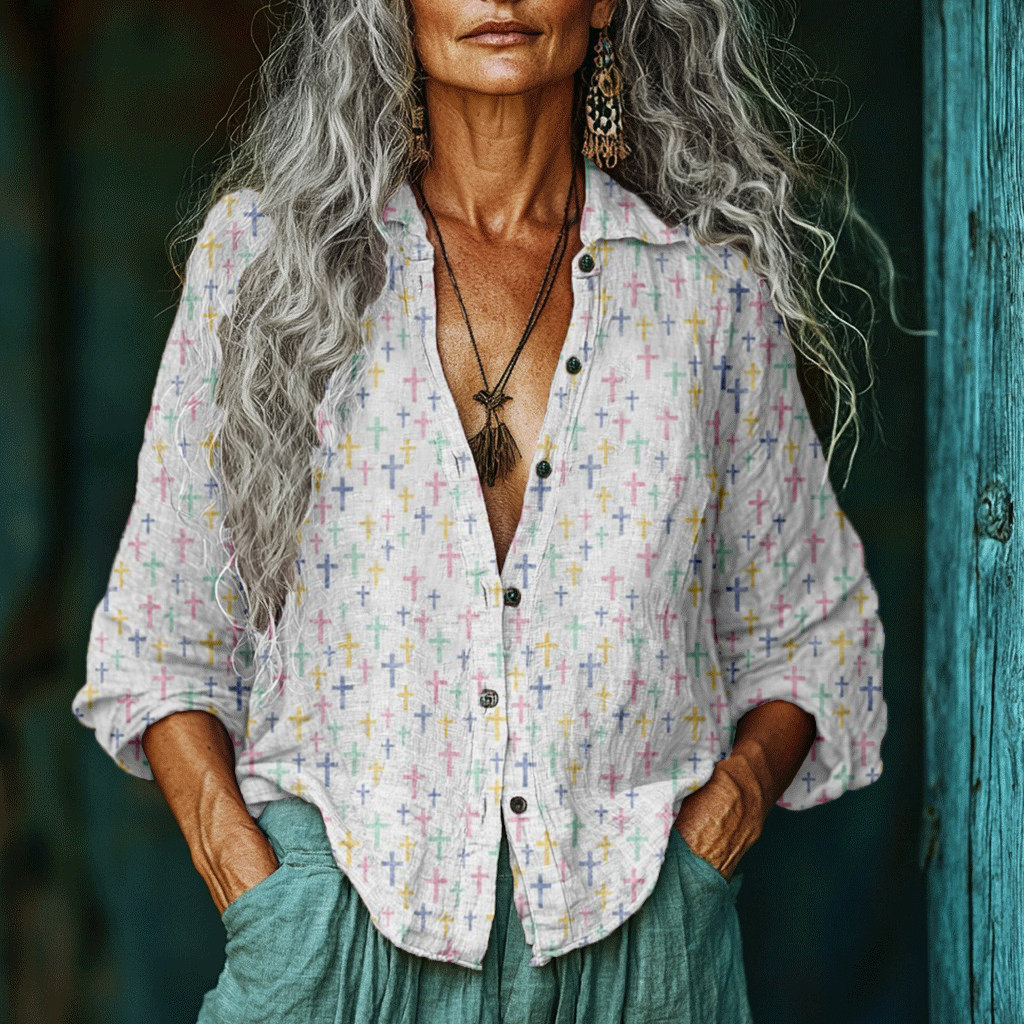 Colorful Watercolor Crosses Graphic Linen Blend Blouse