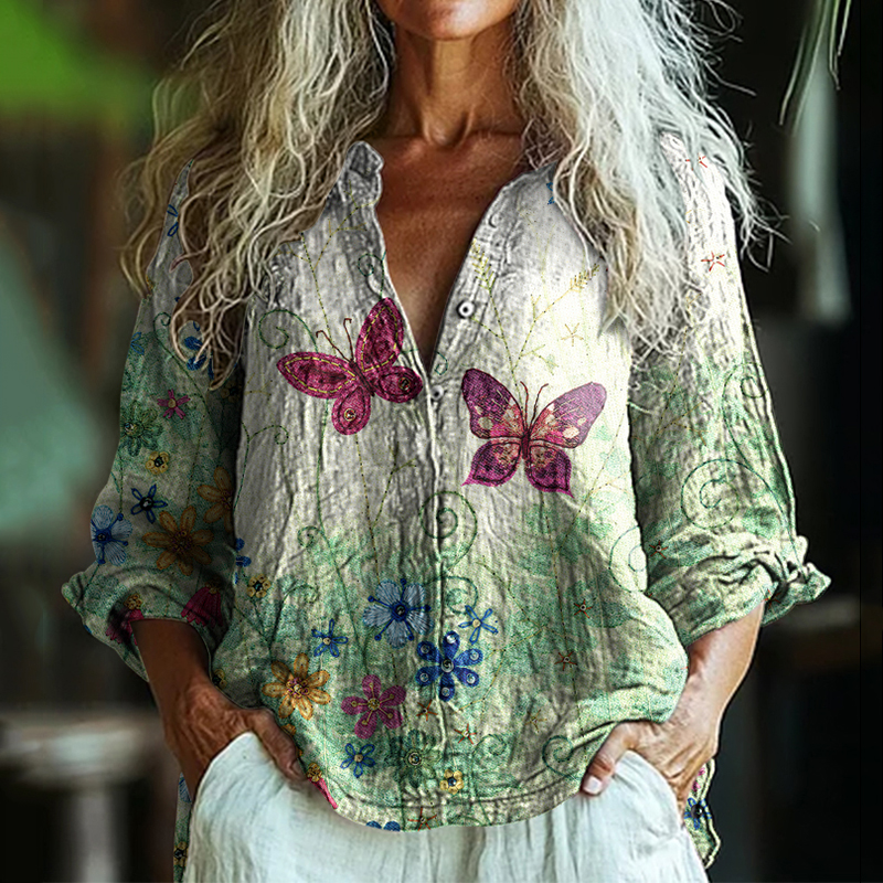 Women's Floral And Butterfly Embroidery Art Linen Shirt