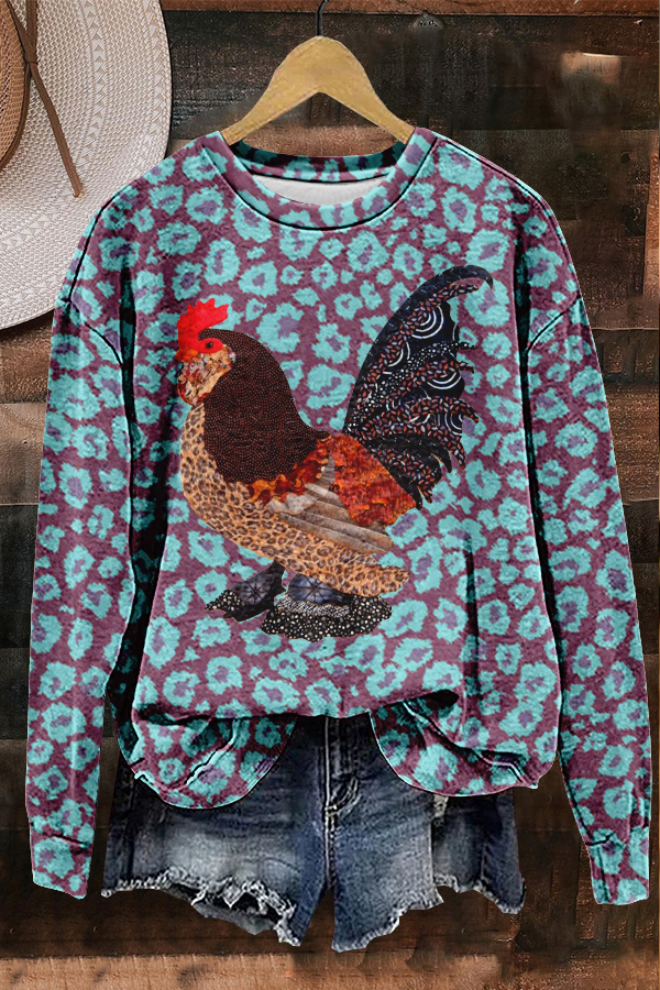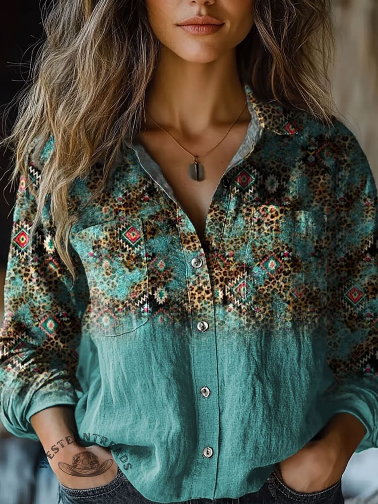 Women's Vintage Cyan Leopard Aztec Art Print Casual Long Sleeve Comfortable Cotton Shirt