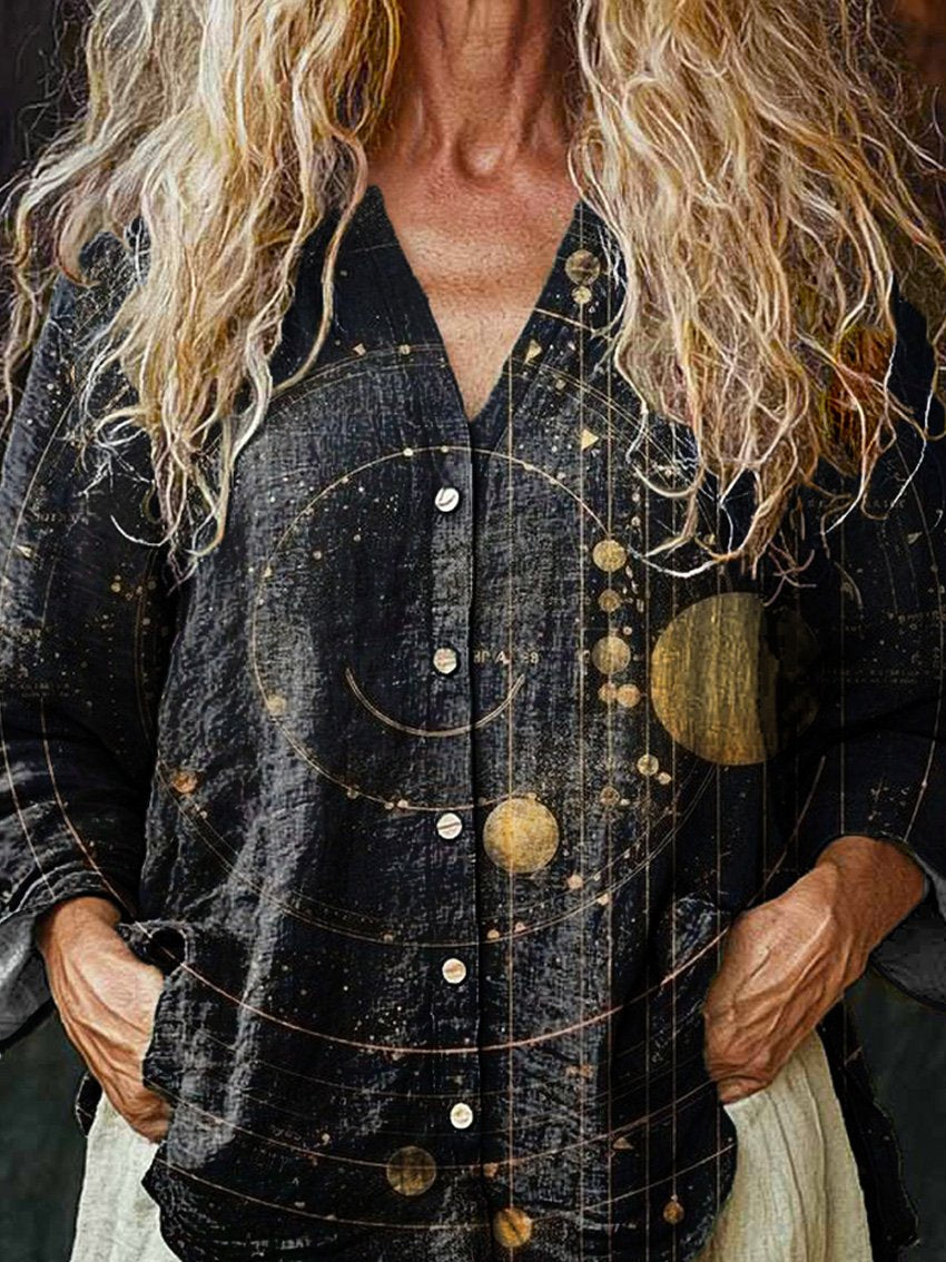 Moon Cycle Astrology Art Printed Women's Linen And Cotton V-Neck Casual Shirt