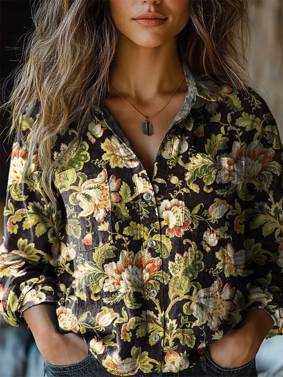 Women's Vintage Floral Art Print Casual Long Sleeve Comfortable Cotton Shirt