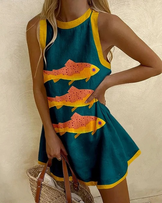 Women's Vintage Fish Art Print Linen Pocket Skirt