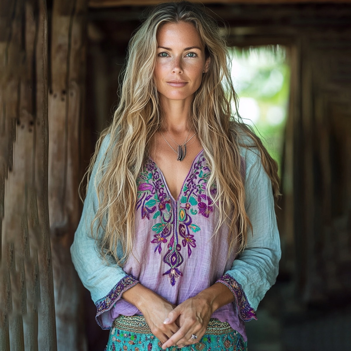 Boho Floral Tribal Embroidery Print Cotton And Linen Blend Loose Blouse