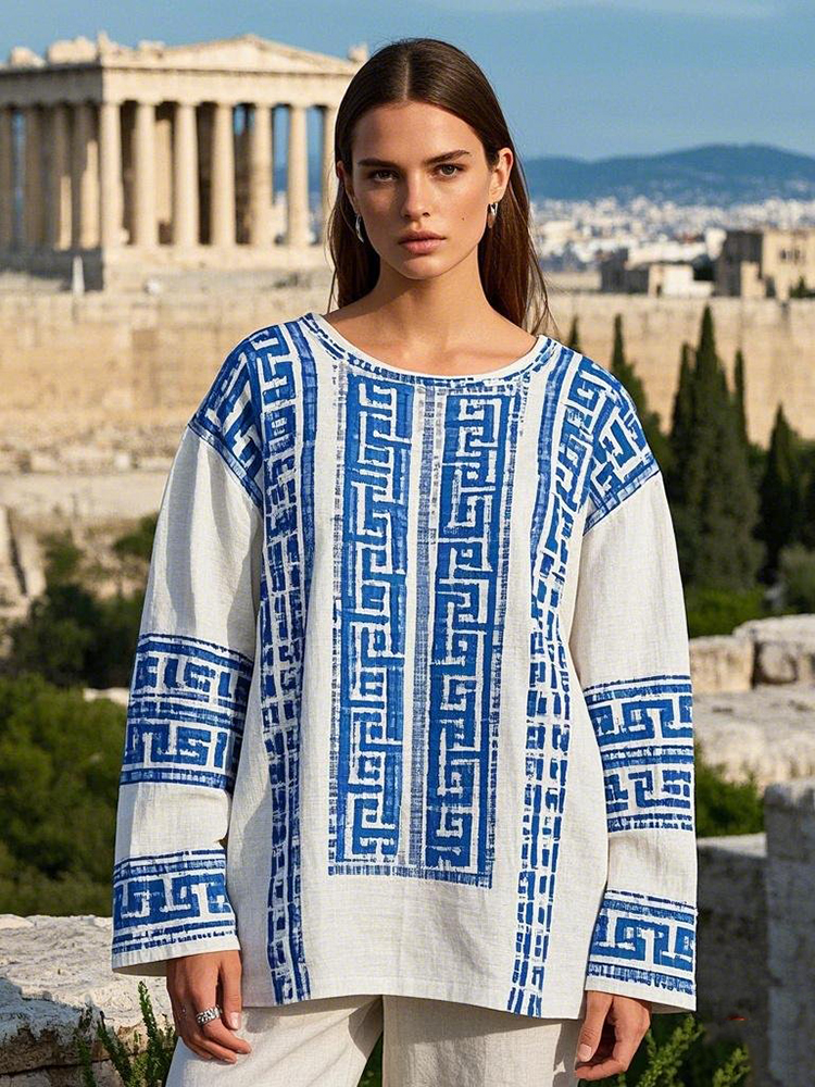 Women's Abstract Geometric Line Pattern Art Print Casual Cotton And Linen Shirt