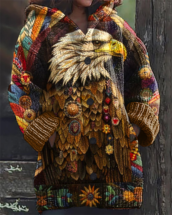 Vintage Native Eagle Print Casual Hooded Cardigan