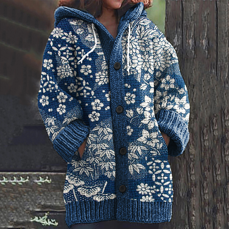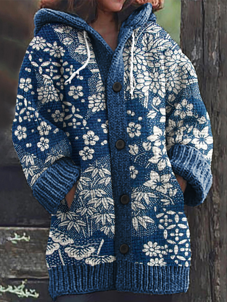 Japanese Art Flower Print Knitted Hooded Cardigan