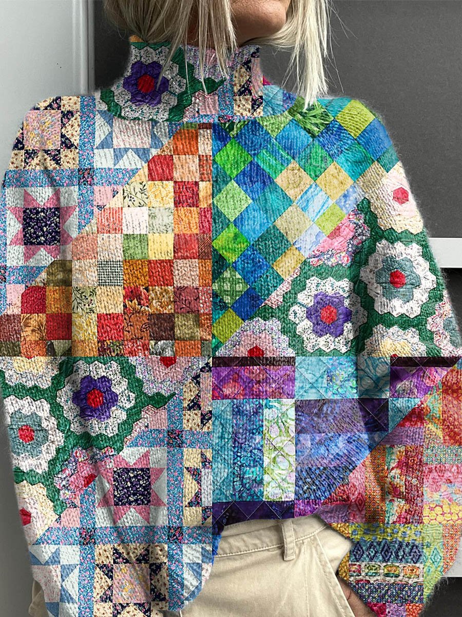 Women's Vintage Geometric Flowers Art Print Knit Turtleneck Pullover Sweater