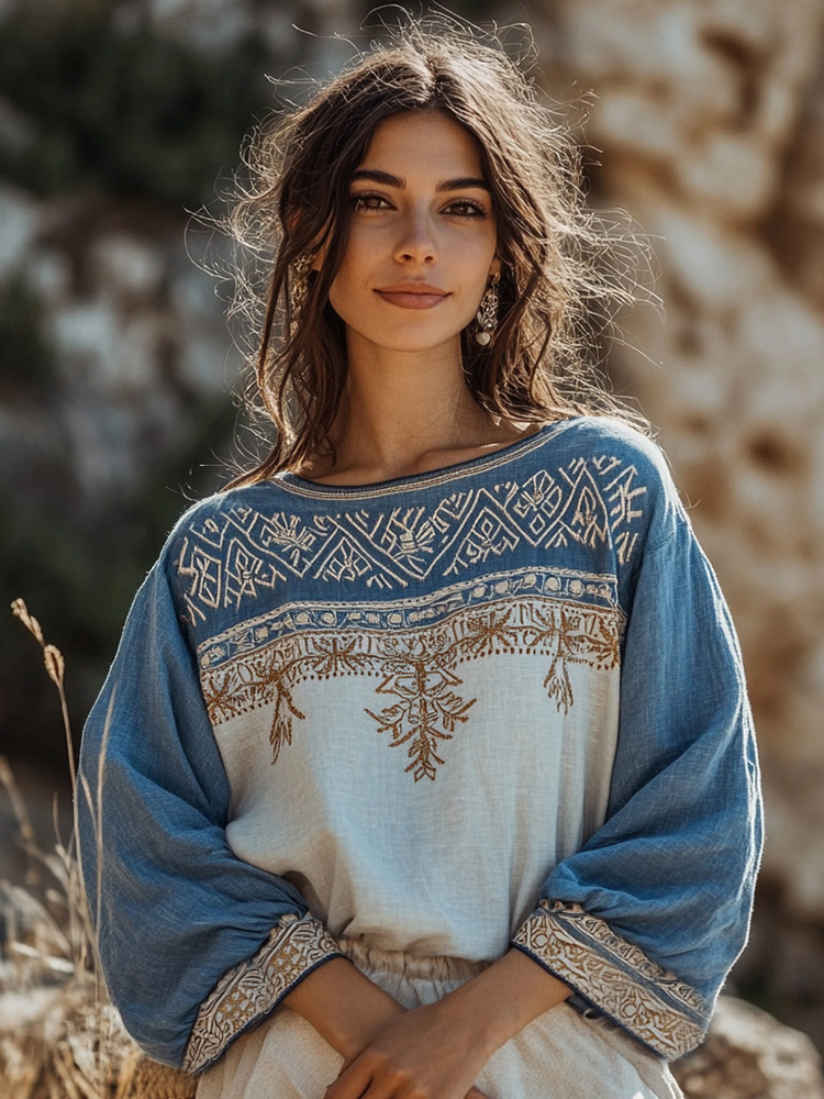 Vintage Tradition Flowers Embroidery Art Linen Blend Cozy Tunic