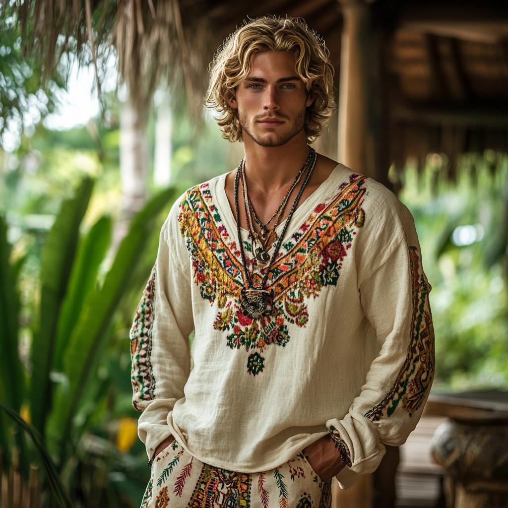 Men's Bohemian Holiday Style Vintage Linen Printed Casual Long Sleeve Top