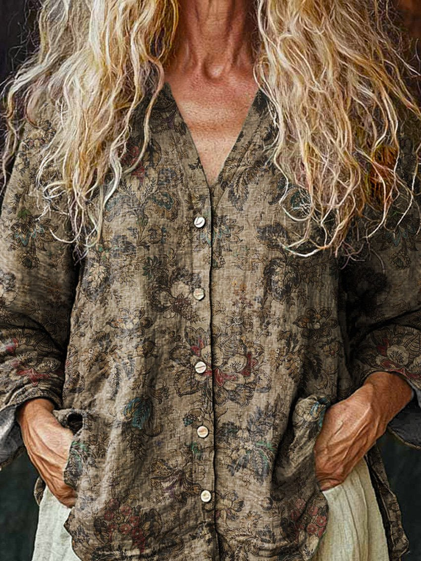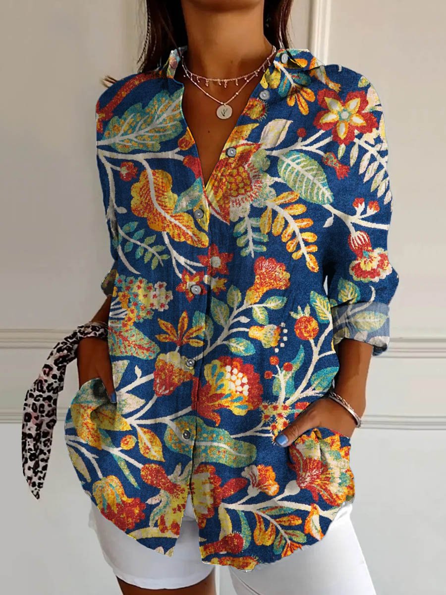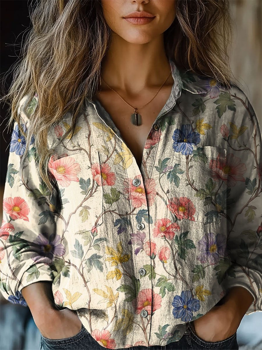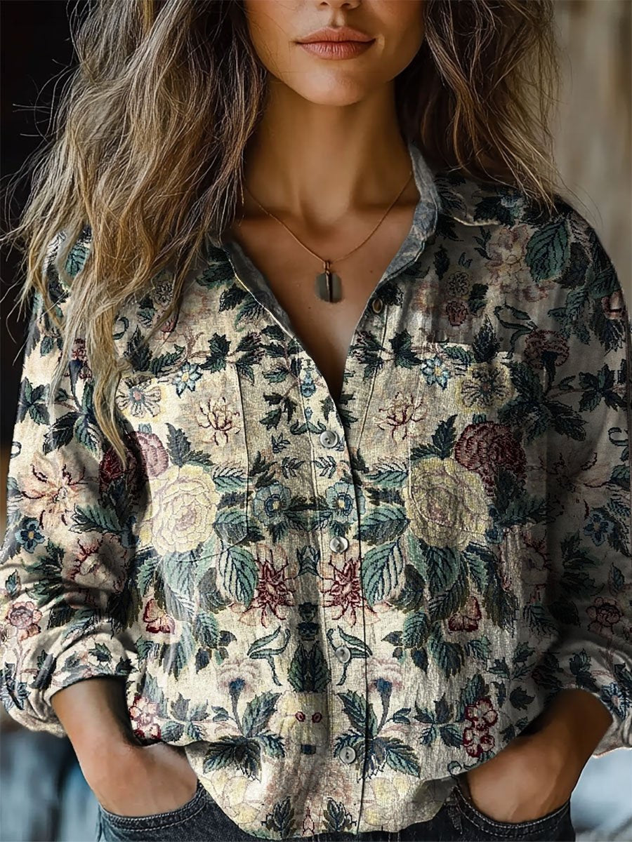 Women's Vintage Floral Art Print Casual Long Sleeve Comfortable Cotton Shirt