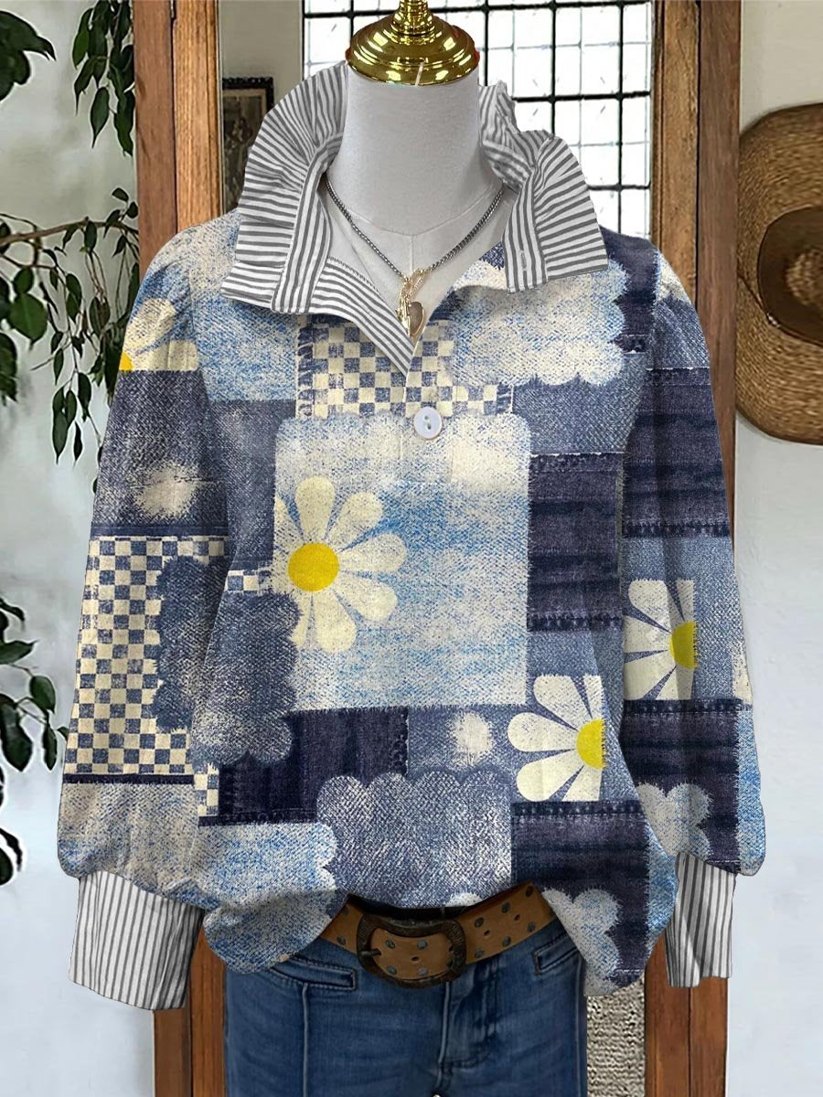Women's Vintage Lovely Floral Patchwork Art Print Casual Long Sleeve Comfortable Cotton Shirt