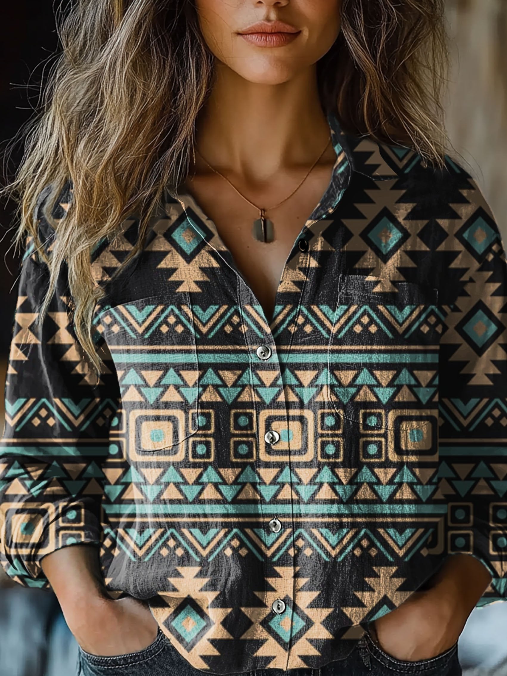 Women's Vintage Grey Aztec Print Casual Long Sleeve Comfortable Cotton Shirt