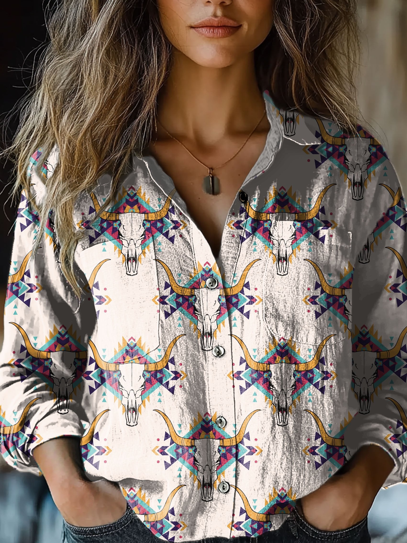 Women's Retro Bull Head Aztec Art Print Casual Long Sleeve Comfortable Cotton Shirt